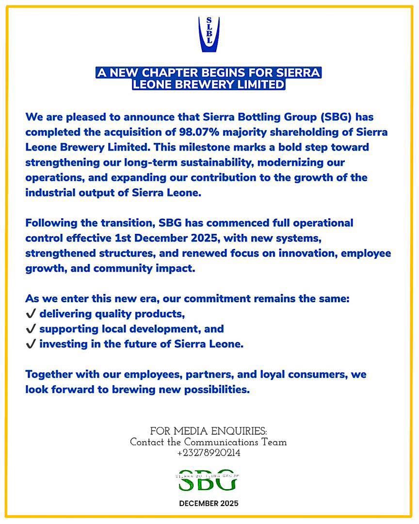 “We are pleased to announce that Sierra Bottling Group has completed the acquisition of a 98.07% majority shareholding of Sierra Leone Brewery Limited,” the statement reads. “This milestone marks a bold step toward strengthening our long-term sustainability, modernizing our operations, and expanding our contribution to the growth of the industrial output of Sierra Leone.”